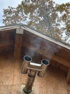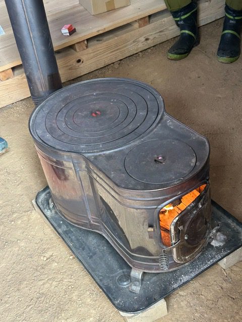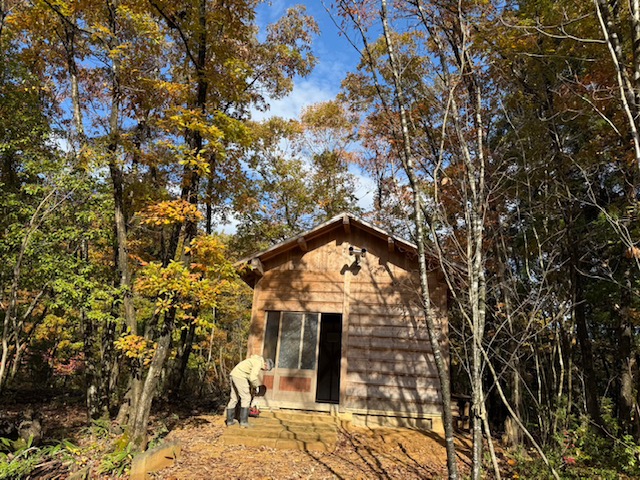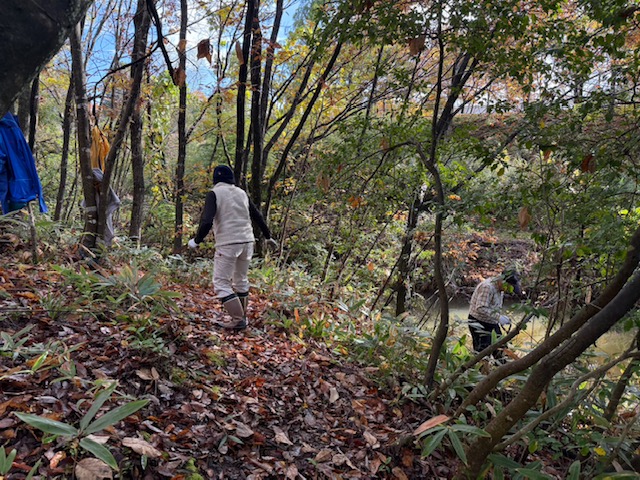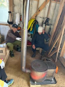 感想:2025年内最終森作り作業日は晴れて冷え込み、冬の訪れを感じる日となった。今年も残暑が厳しく、短い秋は早くも終わろうとしている。私たちの「みんなの里山」はほとんどがナラやクリ・ブナなどの落葉樹なのですっかり色づき、歩道は落ち葉で覆われた。夏のベンチ広場は木々の葉っぱが少なくなり明るくなった。小屋の外は日が差さないと寒くストーブの季節となったので、棚上げしてあったストーブを下して煙突をくみ上げ、火を入れ、みんなで手をかざすとすぐに暖かくなる。煙突からは薄い煙が出てイイ感じ。夏のベンチは軒下に移動して積み上げた。