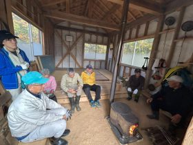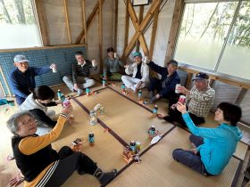 休息は小屋の中の畳の上で、ノンアルコールビールで乾杯し、1年間の活動を振り返っての談笑で盛り上がった。小屋の中を整理し、来年3月末の再開を約束して散会した。【森田記】