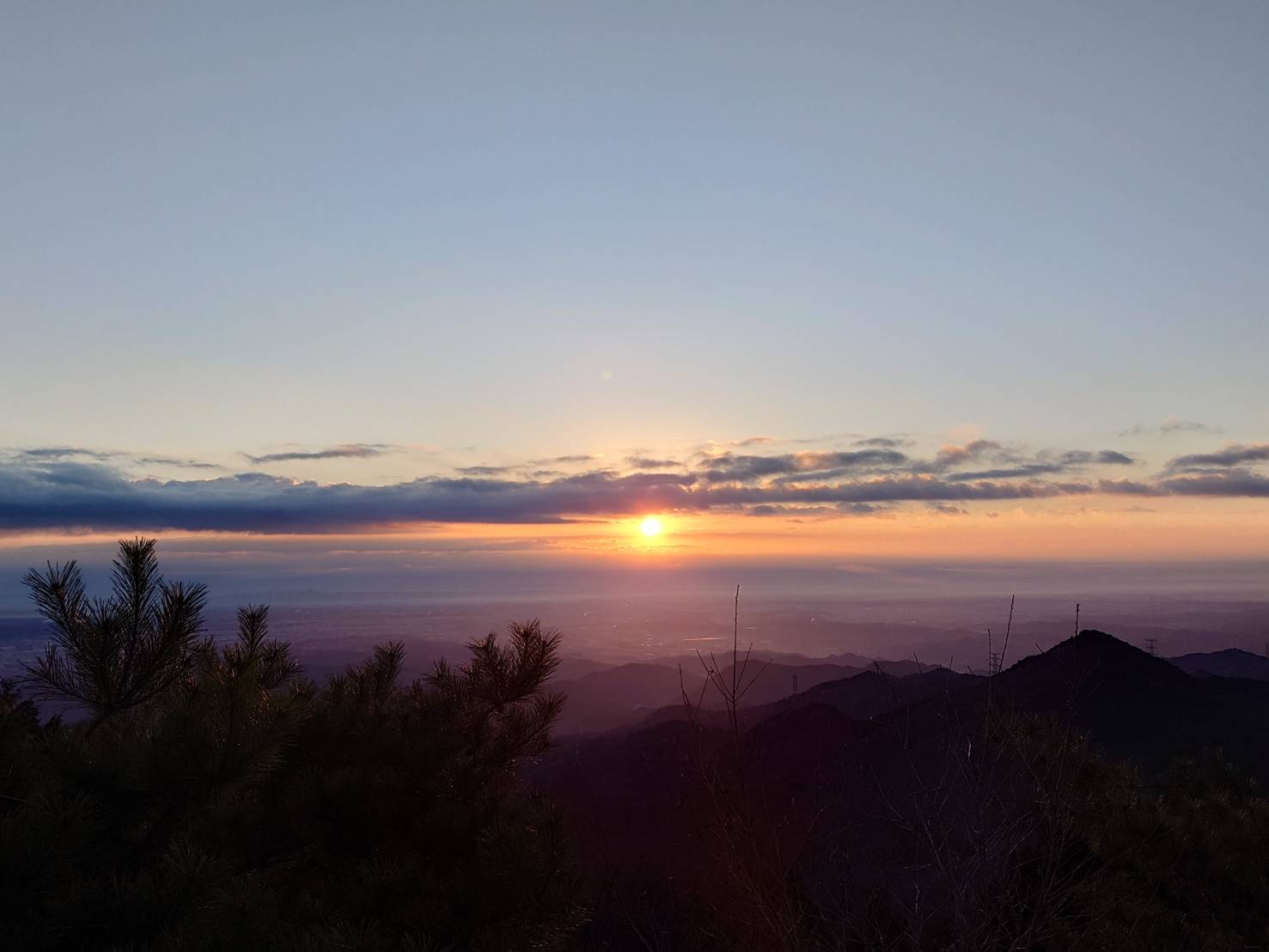 静まり返った漆黒の森の中のトレイル道を暫く行くと谷が開けて眼下には多摩の美しい夜景が見えます。さらに稜線上の緩い登りを幾度か越えて粛々と行くと次第に東の空が白み初めます。日の出の30分前に山頂に到着。御嶽方面から来た人で混雑する山頂で絶好の場所から2026年丙午の初日の出を拝めました。