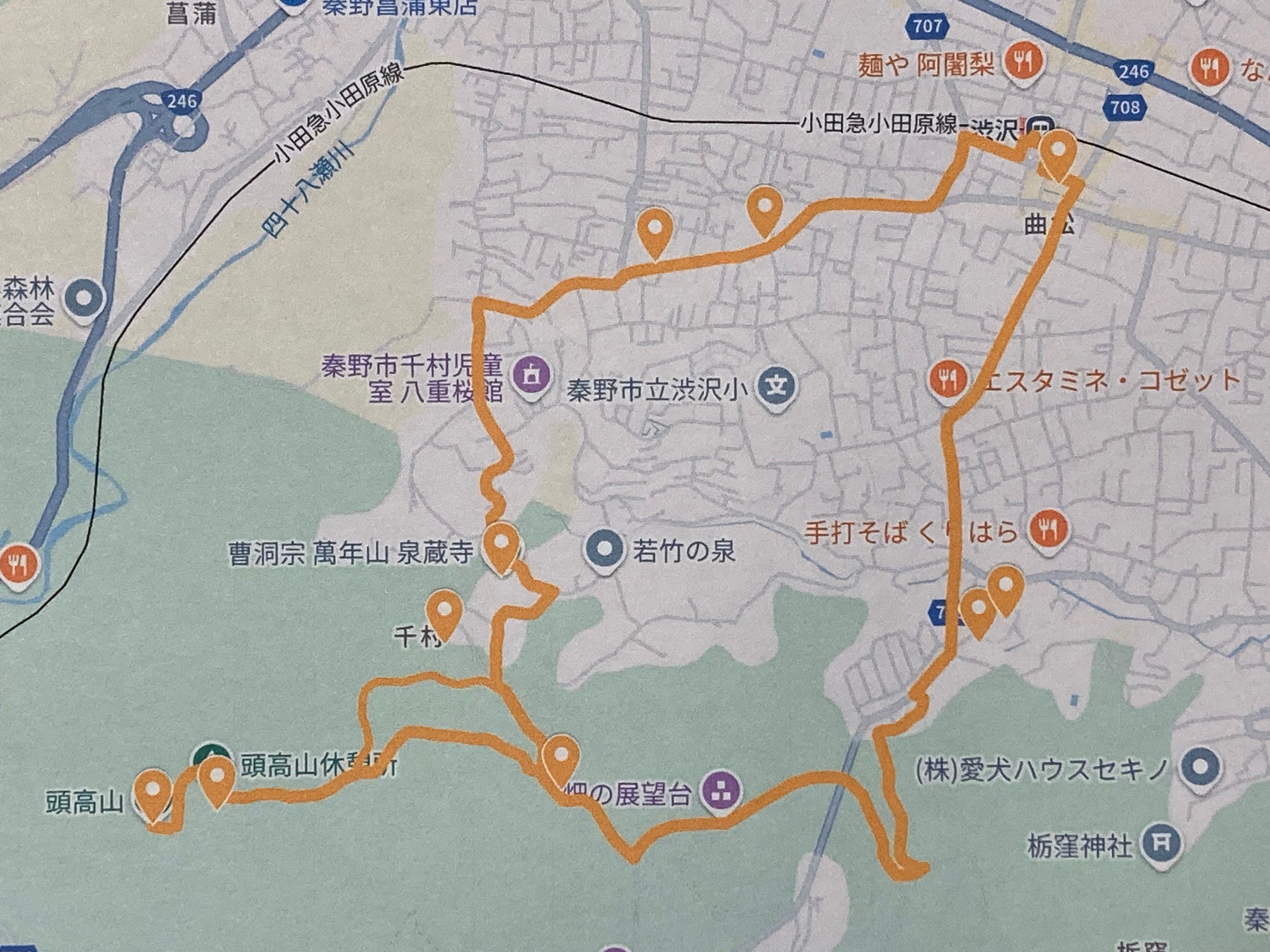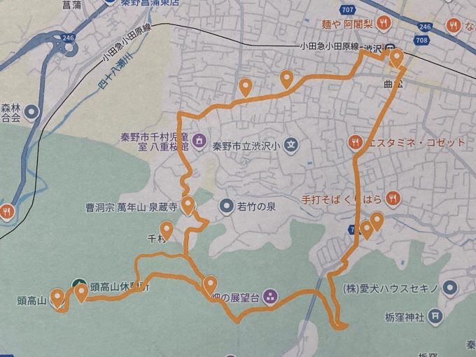 コース 渋沢駅 ⇒ 渋沢丘陵 ⇒ 畑の展望台 ⇒ 頭高山 ⇒ 泉蔵寺 ⇒ 渋沢駅