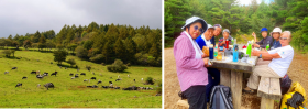 碧空が広がってきて、赤岳や阿弥陀岳が時々見えるようになってきた。昼食後、林の中を下り、今までよりさらに広々とした牧場に出た。放牧牛が遠方に点々と豆粒のように見える。歩道上のブリッジで集合写真を撮って、まもなく牧場とも別れて川俣川西沢を経て、天女山駐車場への林道に出る。