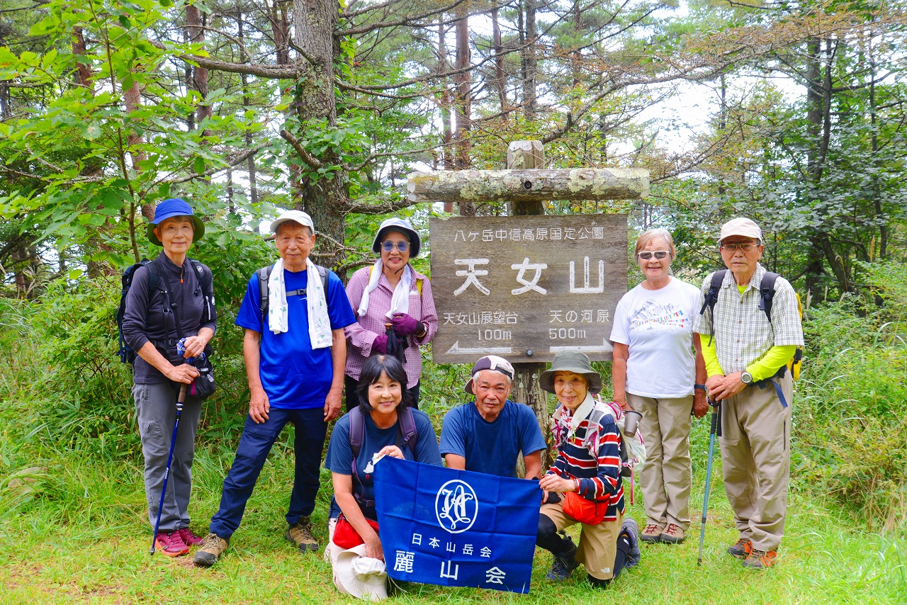 天女山へのジグザグの道を登って天女山山頂に着く。南アルプス方面は厚い雲で遠望できなかった。天女山山頂で会旗を広げて記念写真に納まった。