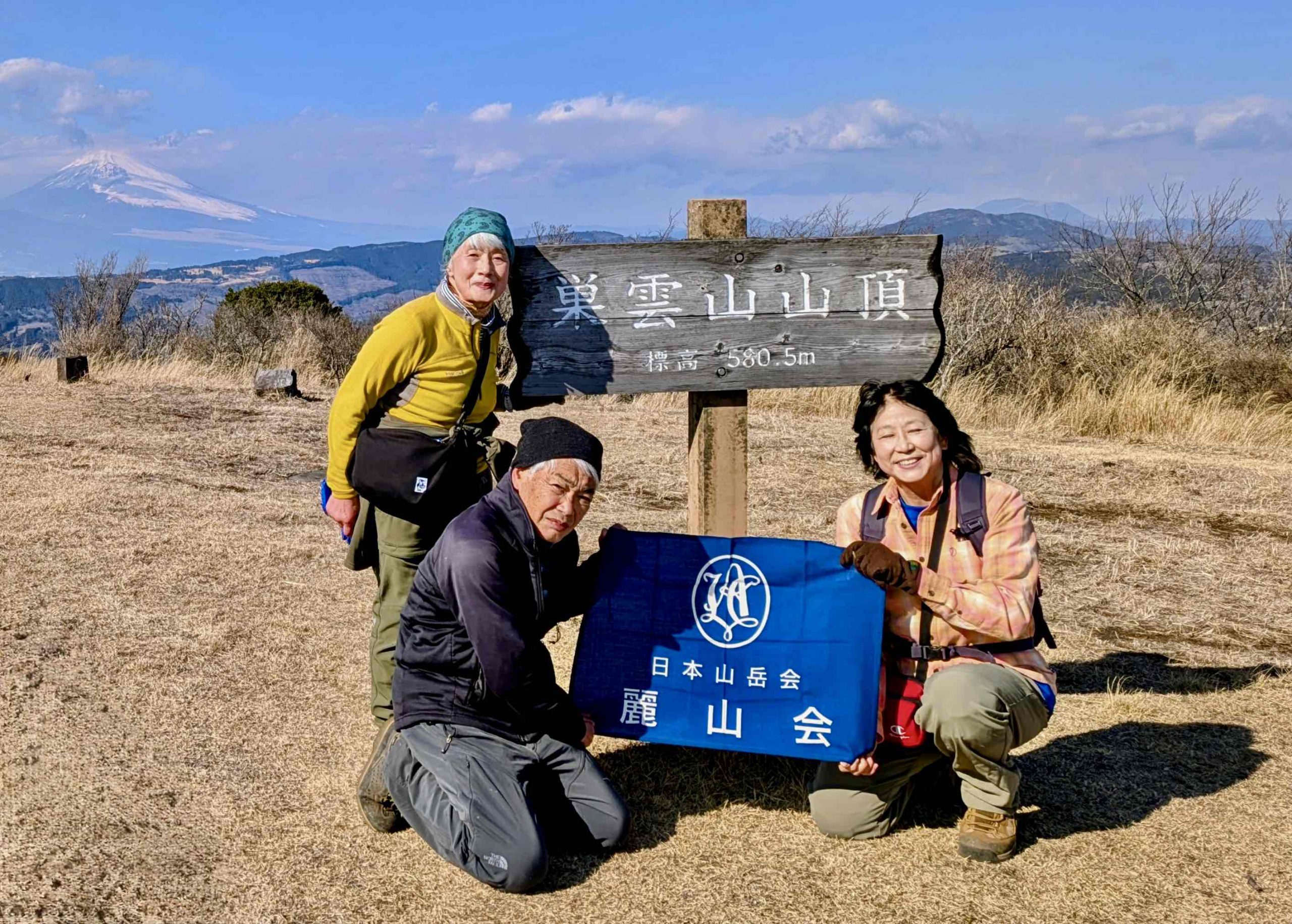 〇熱海駅から宇佐美駅まで、伊東線の穏やかで魅力的な海の景色を眺めながら無人駅の宇佐美駅に着くと、畑島さんが待っておられた。石間さんも来られ、長距離のアプローチで集合時間を10時としたので早々に出発する。「宇佐美踏切」を渡り、住宅街からみかん畑が点在する緩やかなアスファルトの道を大丸山めざして進む。さすが温暖な伊豆半島、1月下旬でも道端にはオオイヌノフグリやホトケノザ、ビワの花、四分咲きほどの桜の花まで咲いており、気分があがる。グランピング施設わき の道を進み砂利道に。そこから本格的な登山道に入り、眺めのいい「どっこい処」で小休憩。「富士見展望ひろば」に進むと抜群の大展望で、眼下に宇佐美の町や初島、大島や青い海を俯瞰できて、鳥のように飛べたならなどと思ってしまう。「大丸山展望ひろば」からは富士山が大きく望まれ、山頂(503m)には四等三角点。そこから阿原田峠に向かってすこし下り、雑木林の緩やかな尾根道をたどり、カヤトの丘を登って開放感抜群で絶景の「巣雲山」の山頂へ。ここは二等三角点。展望台の下には芳香を放つスイセンの群落。石の円形テーブルとイスがあり、風を避けながら昼食とする。