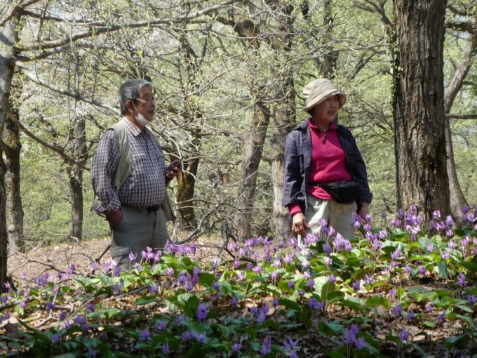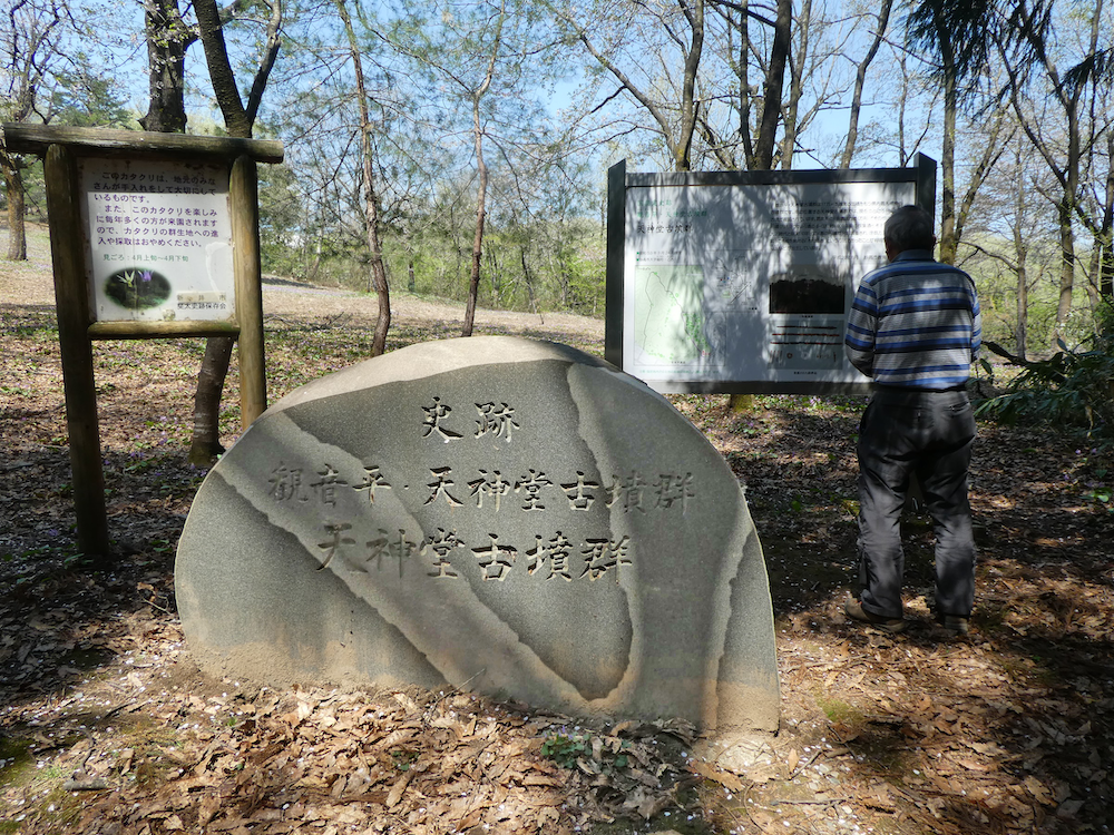 予定通り9 時頃出発し、昨日通った松が峰サンシャインランドに再度行き、妙高山の遠望や、桜と見事な桜並木をゆっくりと楽しむ( 通りかかった多くの車も、ここで止まってゆっくりと桜見物を愉しんでいる)その後我が国の指定史跡となっている天神平の天神堂古墳群に行き、ゆっくりとカタクリの群落を楽しむ。