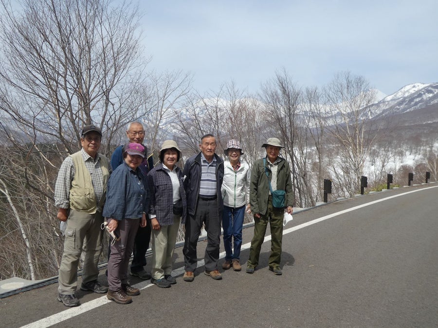 今日で早くもあっという間に3 日目となり、今回の旅の最終日となってしまった。本日の予定は笹ケ峰高原の残雪をゆっくりと楽しむと共に、フキノトウ等の山菜を採取し、色々な山のお花との巡り合いをゆっくりと楽しむ予定である。最初に笹ヶ峰ロッジがある休暇村妙高笹ヶ峰キャンプ場に行って、妙高の残雪とここより妙高山への登り路等を見物し、この雪の多い所にカンジキを履いて今から妙高山の頂迄行く予定だという人達を見送って、回れ右をして帰路についたのでした。途中、途中で路肩のフキノトウを女子組の廣島孝子さんと、川村光子さんのお二人は頑張ってフキノトウを拾われていたのでした。又途中にはフクジュソウ等の群落も所々で見られ大いに目を楽しませてくれたのでした。