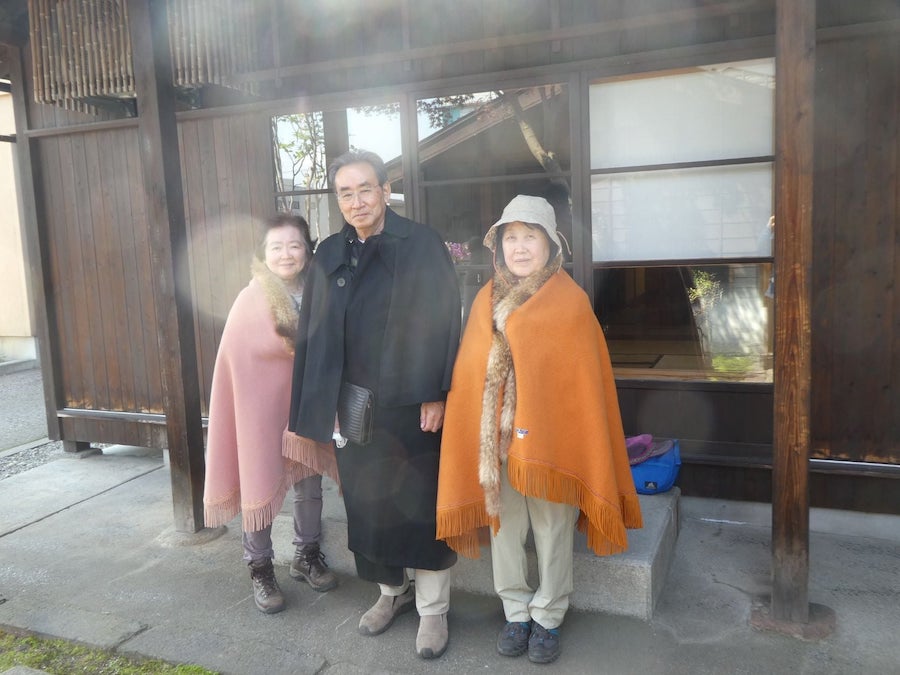 | (高田小町にて昔の防寒着「角巻(かくまき)」や紳士の「とんび」を着こなす3名) |