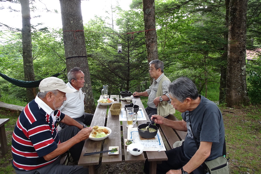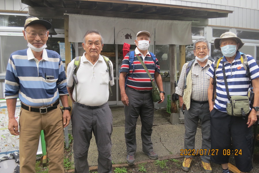 6時に起床し窓を開けるとガスっていて昨日より天気は悪い。朝方まで雨が降っていたようだ。キセキレイが盛んに外の椅子に止まりに来る。7時に洋風の朝食を摂り8時30分にゴンドラ頂上駅に向かう。林道を10分歩き山彦荘前から入笠湿原に入る。天気が良ければお花畑を気持ちよく歩けたと思われるが、今日はガスっていて数メートル周辺しか見ることが出来ない。シモツケソウ、レンゲショウマ、ギボウシ、マツムシソウ等を足元に見ながらゴンドラ頂上駅まで歩きゴンドラで下った。ゴンドラ乗り場からタクシー乗り場まで数百メートル歩き、電車の便が良い小淵沢駅までタクシーで向かったが運転手が前席に3 人乗ると運転に支障があるといけないので、後部座席に4人乗ってくれとのことで大変窮屈な30分であった。小淵沢駅で解散。