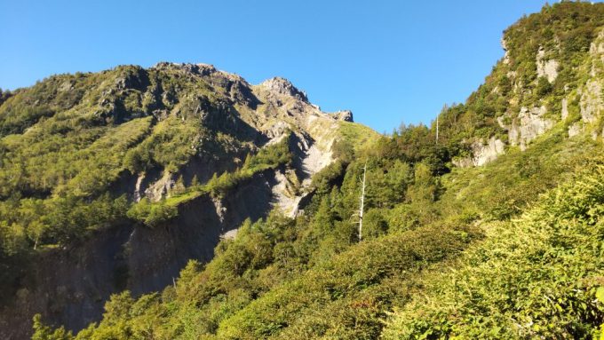 9/16 高橋さんの車で6 時前に山研を出発し、田代橋より更に奥にある焼岳登山口まで送ってもらう。30 分程のアプローチの短縮になるので非常に助かる。暫くはなだらかな上高地らしい散策道を行くが次第に急登の登山道になる。突然杉田さんが『キャー!』と叫ぶので思わず辺りを見渡すと、大きな猿が直ぐ上から我々の脇を恐れずに降りてくる。やり過ごすと更にもう2 頭が後につづいて降りて来た。襲いかかって来ることは無くほっとする。登山道は更に傾斜がきつくなり梯子の連続となる。昨年は中の湯温泉より焼岳に登ったので、上高地側からも登ってみたかったが、予想以上に大変な行程だ。