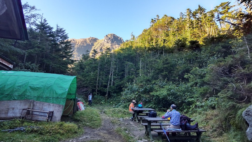 髙橋が山研迄帰ってくると下河辺君と竹内君の二人は既に起きており、ゆっくりと朝食後8時40 分頃山研を出発し、河童橋より取敢えず明神に向けて歩き出しました。明神館迄は河童橋より案内では略3 キロ程度で若い時なら30 分もあれば楽に歩けたのだが、今の僕に取って一時間は掛かるだろうとみていたら、やはりその通り一時間程要してしまった。取敢えず一休みだ。下河辺君は一寸小屋の親爺に挨拶してくると小屋の中に入って行ったのだが、少しすると呼んでいるので入っていき、小屋の主が何か飲みますかサービスしますよというので僕と、下河辺君はコーヒーを頂き、竹内君はアイスクリームを頂いたのでした。下河辺君と明神館とは下河辺君が学生の時剣岳で遭難事故が有り、慰霊碑を剣岳の遭難現場近くに祀って在ったのですが、遠くてなかなか行けないので、明神岳の麓に移設して、毎年慰霊祭をここに泊まって実施して世話になっているようだ。30 分ほど此処で休憩をして徳澤に向かって10 時15 分頃歩き出したのでした。