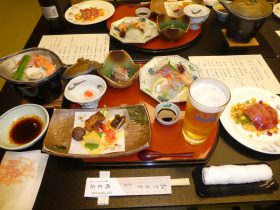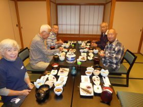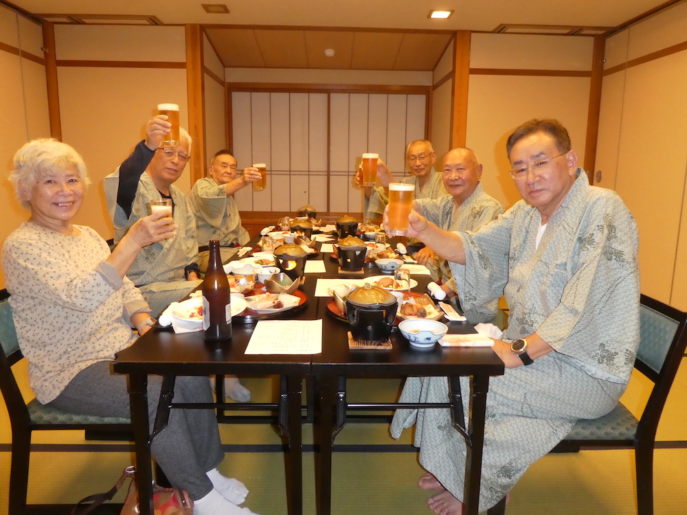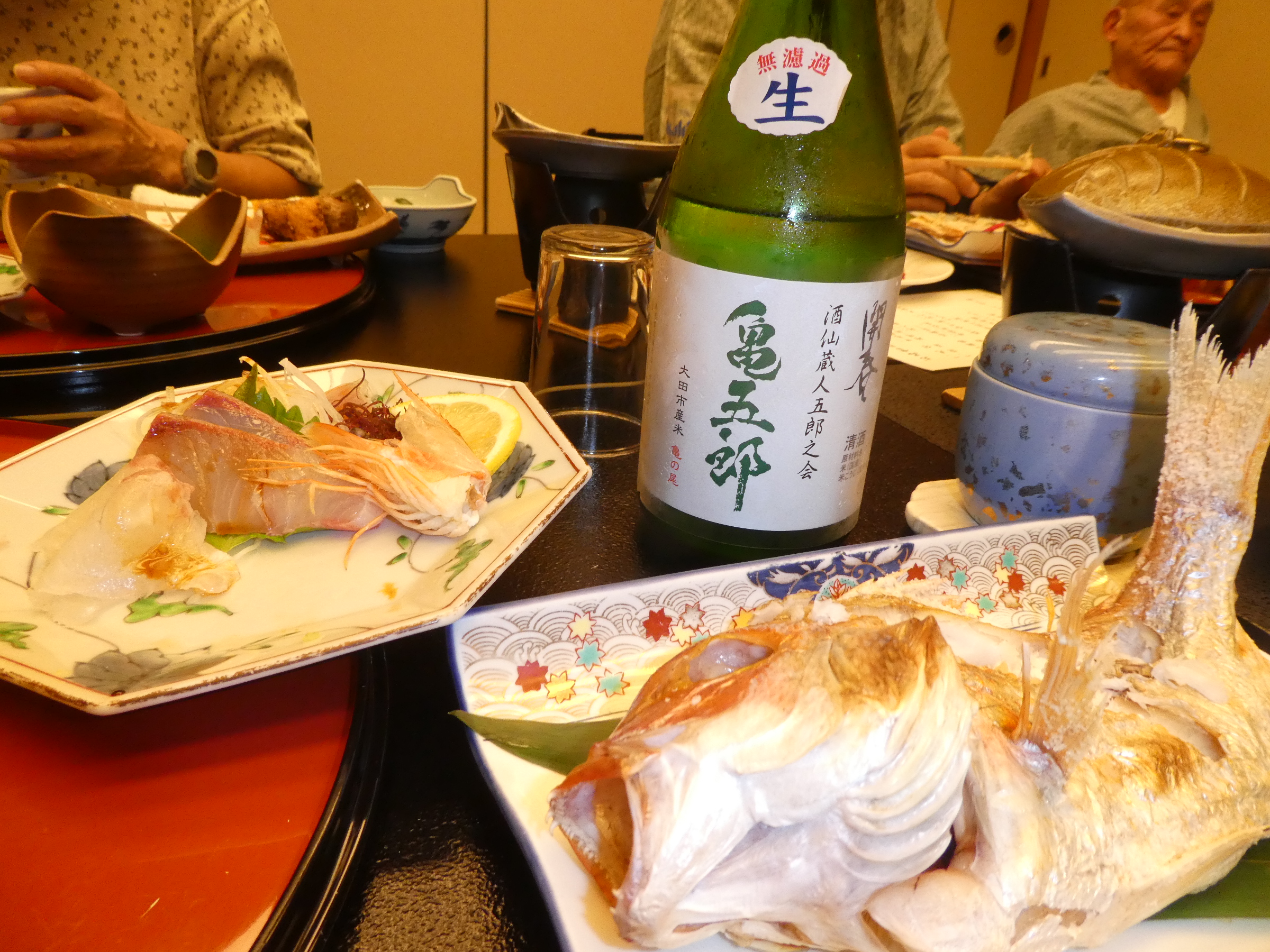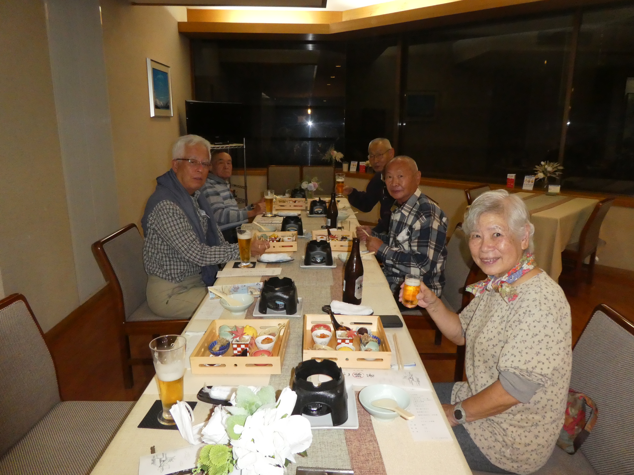 輝雲荘は昭和初めの頃の開業で80 ~ 90 年程度経過している由であるが、歴史ある温泉津では新参者として扱われていると番頭さんから伺った。宿では2 階の3 部屋を用意してくれ、真ん中の部屋を我々専用の宴会場にして、久しぶりの豪華な膳を囲む夕食となった。3 回のコロナワクチン接種を条件とした宿泊代の4 割が割引されるいわゆる旅割の恩恵に預かり、加えて1 人3.000 円のクーポンを交付された。