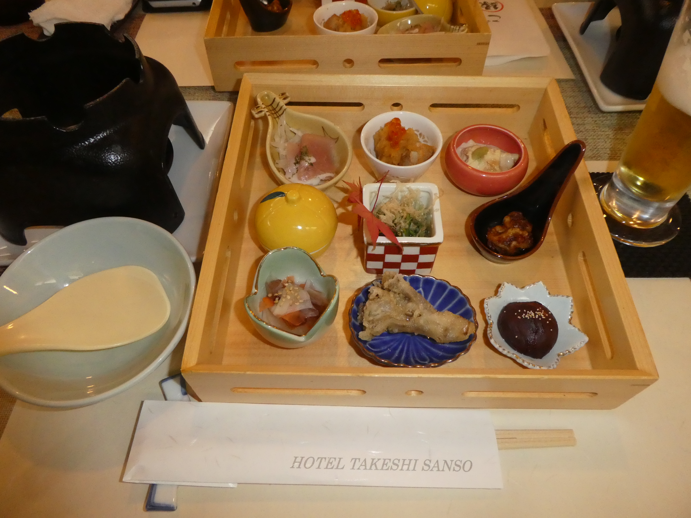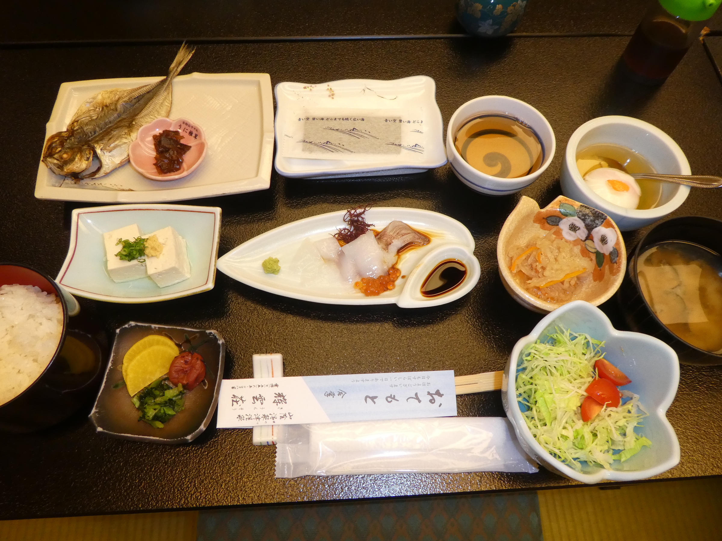 一畑電鉄「出雲科学館駅」近くの高台にあるややレベルの高いホテルで、夕食も「おろちプラン」なる出雲らしい献立で, 彩り宝石箱といった先附から最後のデザートとしての水菓子まで楽しませてくれた。