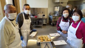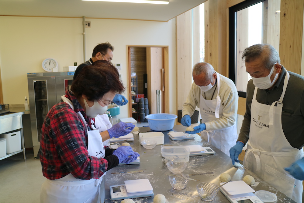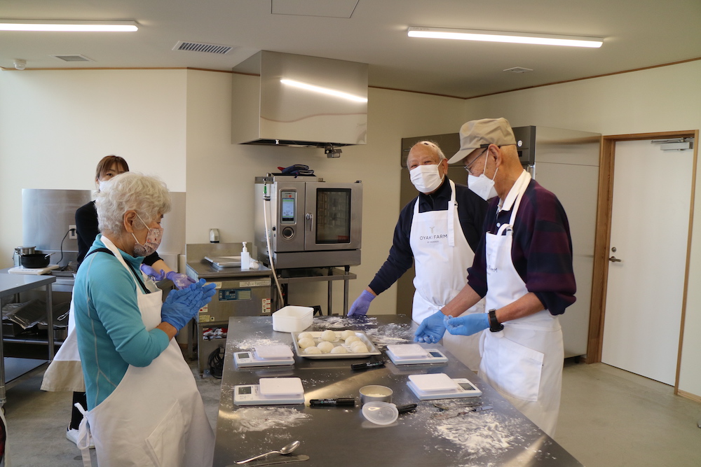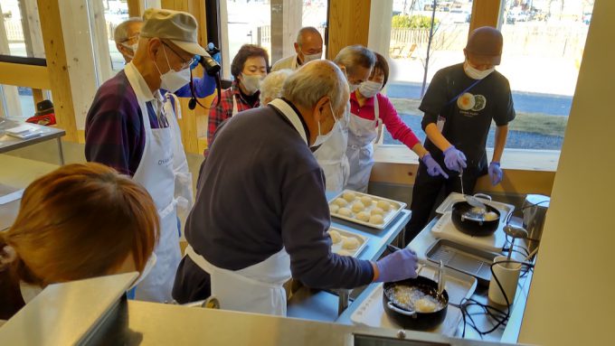 建物は東京オリンピックのメイン会場「国立競技場」の設計者隈研吾氏設計によるもので、日本の木を格子状に並べた独特の建物だ。おやき作りは2 班に分かれてビニール手袋を装着して体験する。おやきの主材となる生地は既に作ってあった。いろは堂の生地は小麦粉にそば粉を加えて香ばしい風味を出しているのが特徴とのこと。おやきに包む具材のあんこと野沢菜も調理済みで用意されているので、トレーナーから生地や具材の扱い方を習い、あんこと野沢菜のおやきをそれぞれ1 個ずつ作る。生地は非常に軟らかく出来ているので、力の入れ加減が難しく、どちらかといえばソフトにソフトに扱うことがポイントであった。