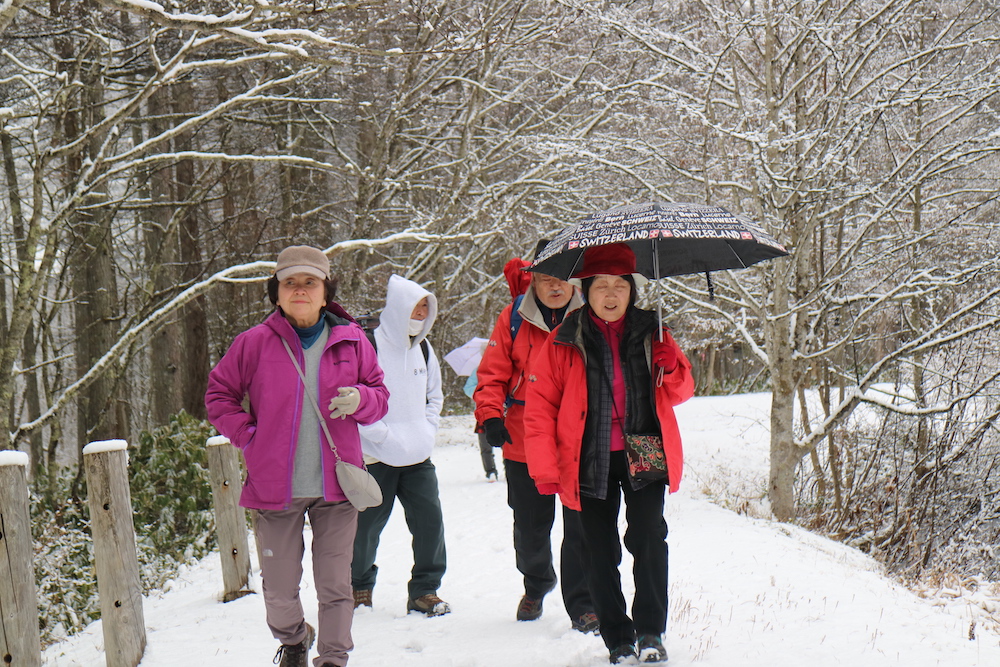出発はみどりが池の横を歩いて、新雪を味わいながらカラマツの小道をたどり、小鳥の小道に至り看板では冬鳥にアトリ、ツグミ、マヒワ、占め、ウソ、キレンジャクなど、留鳥にアオゲラ、アカゲラ、コゲラ、ヒヨドリ、キクイ、コガラ、ヒガラ、シジュウカラ、カケスなどとあったが本日のあいにくの天気では小鳥の声も期待できず隨神門へ。隨神門から続く杉の並木を見てそのまま奥社参道口に戻る。歩いていてたっぷりと水分を含んだ雪の塊が帽子、肩、腕を濡らすのに往生する。