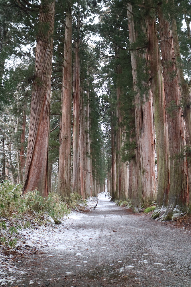 その後、R18号を南下し、信濃町から戸隠へ向かう。戸隠へ入る手前から雪道となる。戸隠スキー場の「くえい食堂」前からスキー場の状態を見る。スキーの研修か講習会をやっているように見受けた。かなりこの時雪が降っているも本日のメインである初冬の戸隠高原の散策に向かう。積雪量は10㎝内外でたいしたことはないが、昨夜来の降雪と雨降りで、視界も悪く晴れ晴れしい気持ちになれず、どこまで行くかと悩むところであったが、当初予定の戸隠牧場から「ささやきの小道」を歩いて隨神門に到り、杉木立を歩いて奥社に参拝を変更して行程を縮小した。