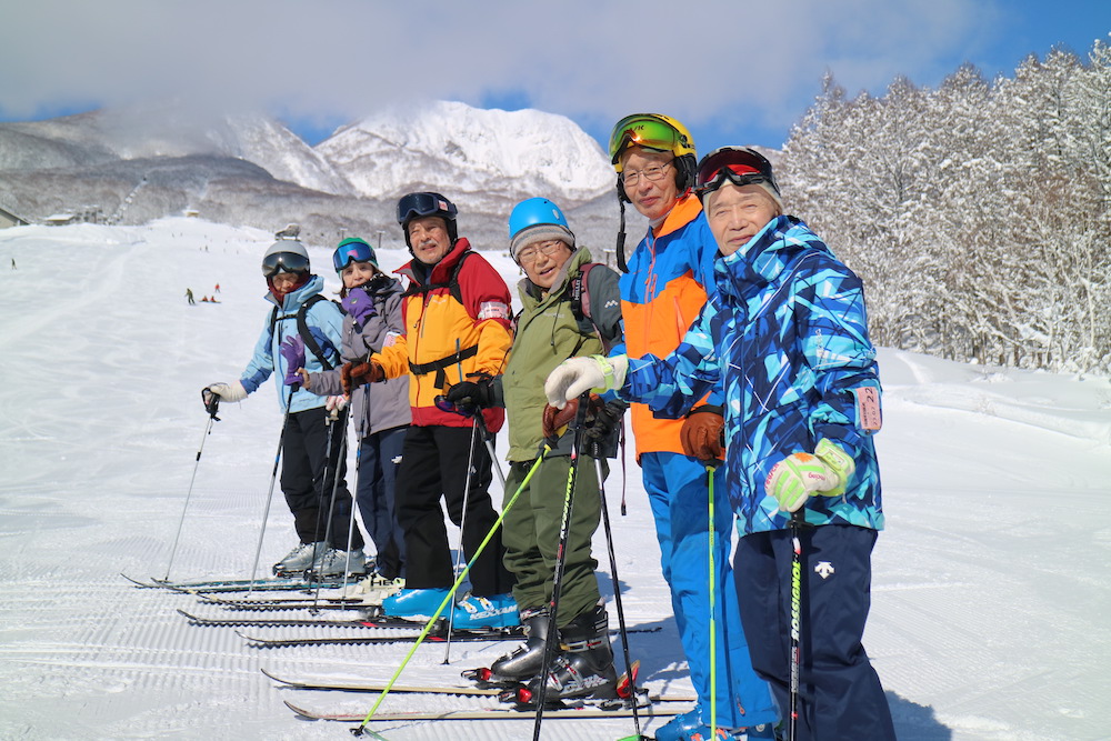 新雪が降った後なのでゲレンデの状態はベストである。快晴の下、妙高山をバックに五体満足とはいかないが、84 歳で初すべりができる幸運にまず感謝。石原さんご夫妻、西村さん、横田さん、伊藤さん、などベテラン組は華麗なスキーさばきであっという間に下まで一気に滑り降りる姿を後ろから眺めながら、一本目を慎重に滑り出す。高橋さんが私のすぐ後ろでサポートしてくれているので、安心して滑っていける。最近は、雪の世界とは縁が遠くなり、骨も脆くなっているので、転倒骨折は絶対に避けねばならない。何本か滑るうちに徐々に慣れてくる。南端の一番長いリフト(2 km)に乗り、このコースから展望が大きく開け、野尻湖、斑尾山、志賀高原方面の景観をゆっくりと楽しむ。あとで聞いた話ですが、85 歳の椎名さんがノンストップで滑り降りたとのこと。すごいの一言だ。普段、相当のトレーニングをされていることと敬意を表します。