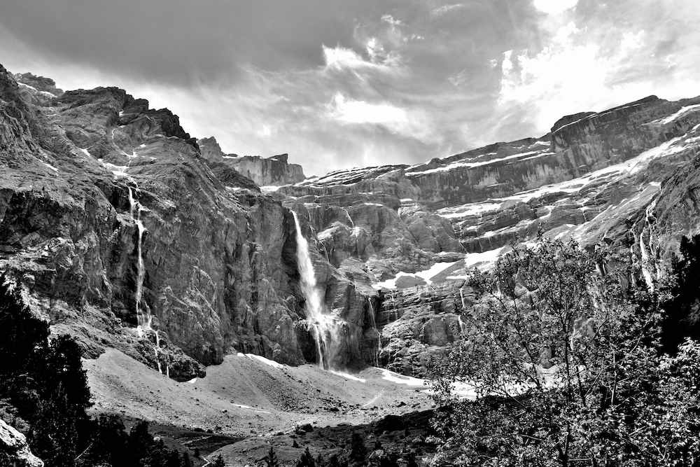高さ1000m 以上の岩壁に囲まれた岩の大円形劇場といわれるガバルニ―圏谷は世界遺産に登 録されたピレネー随一の景観である。渓谷、大滝の下には緑豊かな草原とお花畑が展開する。ツー ル・ド・フランスのコースにもなっているが、古くからヤギや牛の遊牧生活が営まれていたが、 今でも心癒される情景である。岩にへばり付いているムシトリスミレの花と弦は日本の花とは 比較にならない程大きく印象的であった。