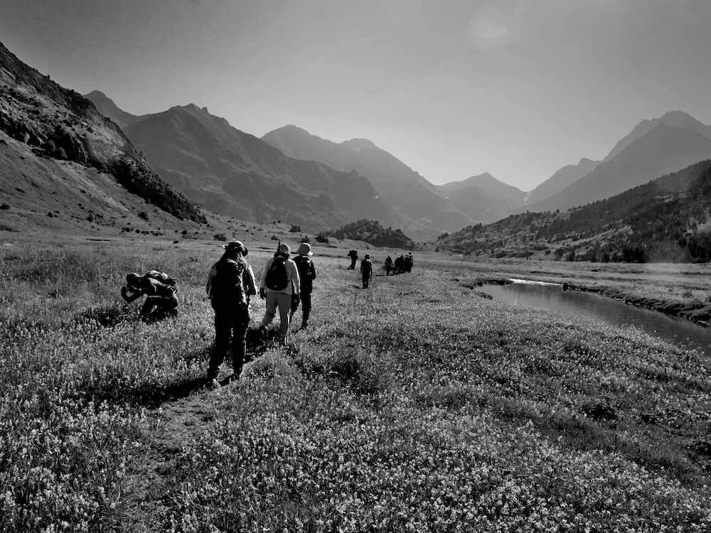 国境のポルタレット峠を越すとトルラの町に泊まる。これより4 輪駆動の車に乗り換えオルデサ渓谷からビニュマール峰の南西側のオタル谷に入る。広大な草原を歩き、拠水林はないが幾筋もの小川をわたり、2 時間にわたるフラワーハイキングをした。日本の山で言えば尾瀬ヶ原を小さくした湿原である。ここではスイスアルプスより大きいエーデルワイズ、ツリガネニンジン、リンドウ、サクラソウ、オダマキ、大きいアザミなど見られた。
