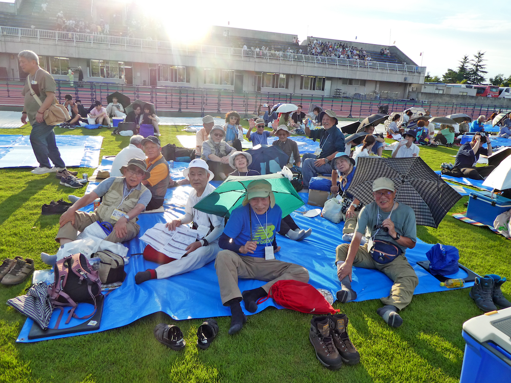 指定されたB 会場で、トイレの帰りに迷わず戻ってこられるよう、目印となるカメラマン席の下方を陣取り、芝生の上にブルーシートを敷き、場所を確保。ブルーシートの番を交代でしながら、暑さ回避を兼ねて近くのショッピングモールに行く。私は、昨年も参加された下河邊さんに付いて行き、花火記念切手、お酒、凍ったお茶等を購入。花火が始まるまで、一今回参加されている皆様と軽食を楽しみ、お話をしたり、横になって、なんとなく寝たりして過ごした。