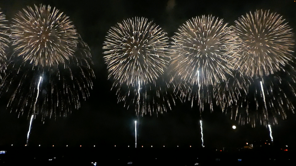 なぜ「Jupiter」だったのかというと、「フェニックス」は2004 年に起こった中越大地震からの復興祈願として始まったのです。震災のあと、ラジオで被災者を勇気づける歌としてたくさんのリクエストが集まり、何度もながれたのがこの「ジュピター」だったからのようです。青や赤、黄色などの色とりどりの花火が上空に咲き、音と光が一体となって身体にしみ込んでくる臨場感はなんとも言えず格別でした。中天に輝く満月もいつも綺麗に見える。