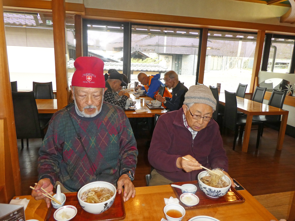 200 メートル程度離れたところに在る、国指定重要文化財 浄光寺「薬師堂」を参拝する。本堂右側のこぢんまりとした仁王門をくぐり石段とも坂道とも区別がつかない参道を上る。途中から「さくら樹木葬浄苑」への分かれ目がありました、チョット上って杉木立の中に重要文化財薬師堂がありました。この建物は、応永15 年(1408 年)に再建され、室町時代初期の代表的建築物という。重厚な茅葺きで周囲の景観に溶け込んでおり、薬師如来像、十二神将、薬師堂壁画、金銅仏など多くの文化財が収められているという。冬期故か辛うじてお賽銭だけを受けるくらいしか戸が開いておらず貴重な文化財を拝観することが出来ませんでした。夕食後に椎名さん合流し賑やかになる。