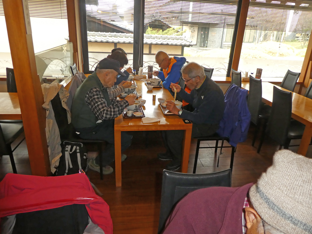 妙高へ向かう途中のお店「文ざ」にて全員「A セット」(ソバと海鮮丼)で戴く。一同満腹。車中、小笠原さん「今晩は他のお客さんは居ないので帰ったらお風呂に入って、食堂も解放するので飲んだら」とすすめられる。夕食の頃にはチラチラ降雪があった。