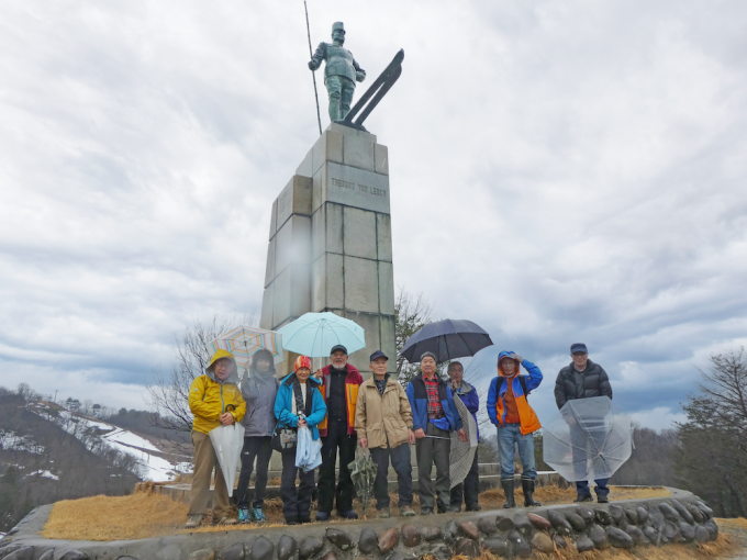 金谷山にはレルヒの記念碑が高々と建っている。例年なら積雪があるのだろうが、傘を差し赤土の道を銅像の基へ、高田平野が一望できる。すぐ近くのスキー場は地肌が出ており閉鎖状態でした。傍らの圧雪車ショボン。