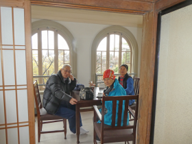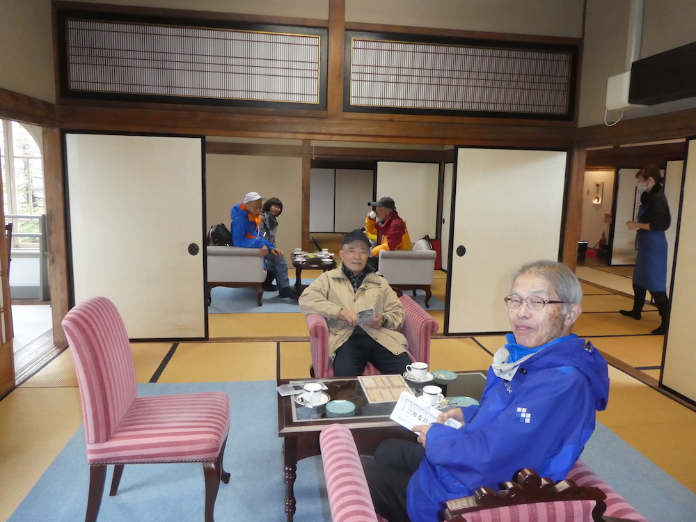 門から玄関に通ずる生け垣の中に長岡外史の胸像が雪囲いに覆われ建てあり、立派なひげが印象的でした。玄関を入ると、左側に男子応接室が、椅子とテーブル ・・・ 1 ダーステーブルと呼ばれ昔は12 席で食事がされたという。その奥には、婦人応接室、ピンクのカーテンで女性らしい作り、入口扉の裏面に鏡、位置が低いことから当時の身長が伺えます。部屋ごとに飾りのちがう天井飾り(シャンデリア)、漆喰とカーテンの色も雰囲気や印象も全てちがいます。赤絨毯の廊下から2 階へ靴を脱いで和室へ、茶室や子供部屋。丸く出っ張った部屋が1 階と2 階にあった。当日はこの部屋でコーヒーを頂いたが気になっていた。これは半温室ということは後で知りました。