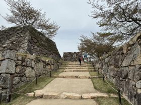4月に初めて昨日は雲海が現れたそうですが、今日は黄砂に霞むお城でした。午前は立雲峡(朝来山756m の中腹にある)の展望台から竹田城を望み、昼食後にいよいよ竹田城跡登山開始。400 年以上前に築造された野面積みの石垣は見事な造りで、城郭は壮大。景色も良くて楽しめました。岡山駅で3 日前にスタートしたツアーは今夕京都駅で解散、天候にも恵まれ楽しい4 日間でした。
