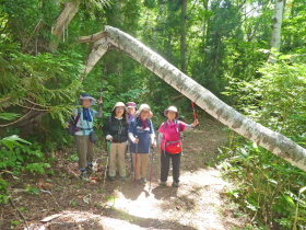最終日は一昨年もこの時期に山想倶楽部で歩いたルートでした。その時は真っ赤な色をしたタマゴタケの群生があり、このキノコは図鑑によれば、西洋料理の高級食材と書いてあったので、採取しようと思ったのですがほとんどの方が色からして毒キノコと言うので、自信を無くし採取を諦めた経緯が有りました。後日再度図鑑を見て、やはりタマゴタケに間違い無いと確信し、今度こそ採取のリベンジを果たそうと目を凝らして歩きましたが、残念な事にこの猛暑で記憶していた群生地には全く生えていませんでした。しかし他の山野草が色々と生えており、植物の好きな方達は写真を撮ったり、調べたりと、のんびりハイキングを楽しんでおりました。