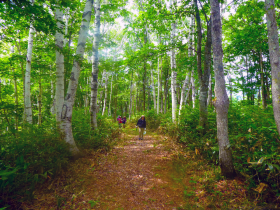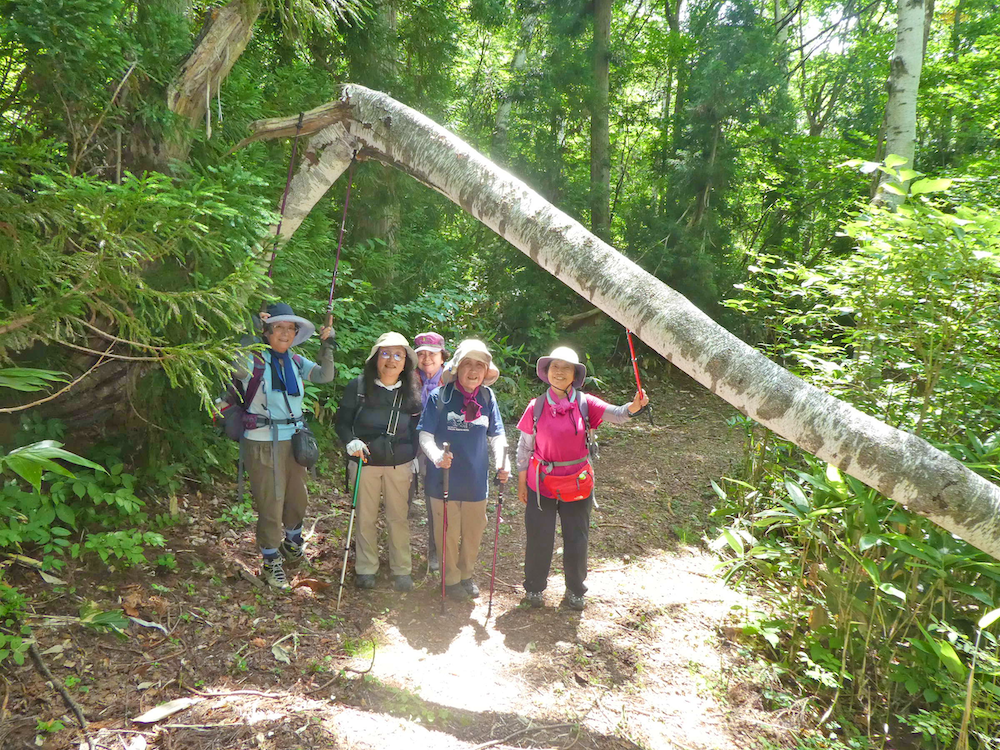この日は一周9.9Km の笹ヶ峰高原を約6 時間かけて歩きます。トレッキングコースとして良く整備されていて、箱庭的ではありますが、放牧された牛達とも対面出来、ヨーロッパの牧歌的な雰囲気と白樺やブナの林の森林浴を堪能できる、とても気持ちの良いエリアです。