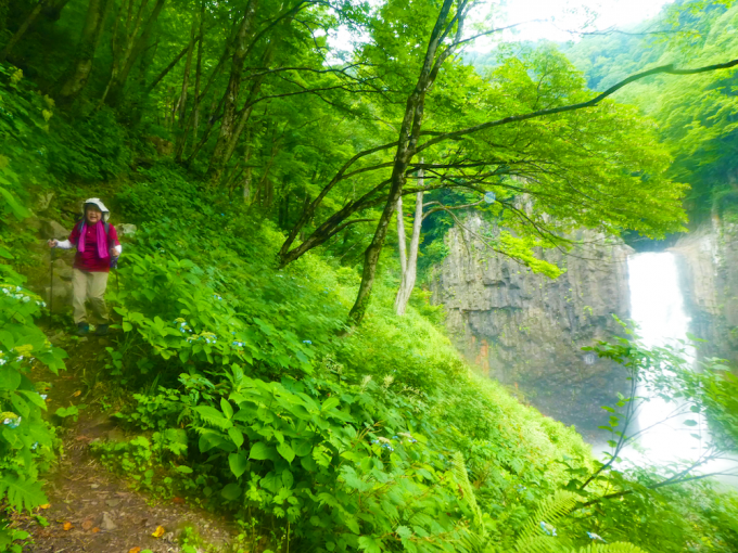 出発地点の黒姫高原スキー場から、黒姫山の山肌を水平にトラバースして、妙高高原の苗名滝の上部に出て、そこから苗名滝の脇を下って午後1 時頃に日本一美味しいと言われている流しソーメンの店で遅い昼食( 流しソーメンと山菜の天ぷら) を取ってから妙高高原駅で解散となりました。