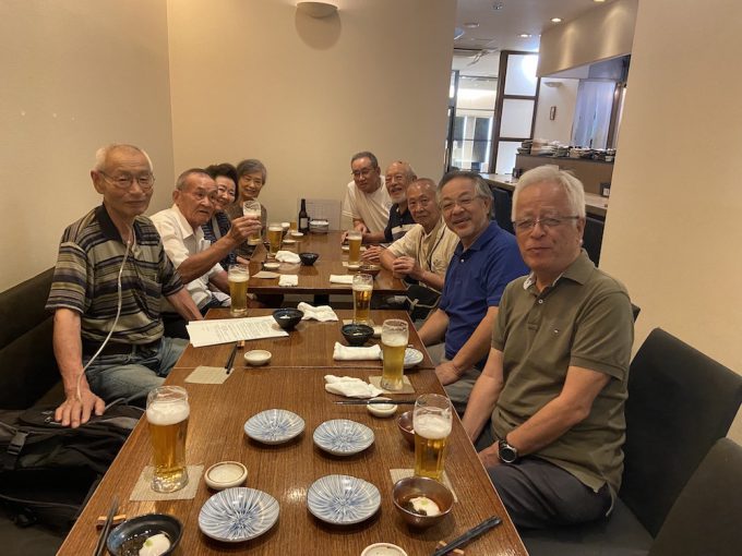 倶楽部の平均年齢も80歳を超える状況の中、これまでの高橋さんの重責を代行してもらうのに下河邊さんが快く(仕方無く)引き受けて頂き、突然の開催にも関わらず、東京はじめ千葉、神奈川、埼玉、新潟から10名の参加表明があった。このことは倶楽部の多くの方が皆高橋さんに感謝している気持ちの現れと思う。会は最長老の吉永さんの乾杯の音頭で幕が開き、酒が回らないうちに今後の倶楽部の運営方針と事務的な引継ぎ事項の確認を小笠原と下河邊さんから発表が有り、早々に高橋さんを中心に思い出話に花を咲かせて楽しい酒宴となっていった。