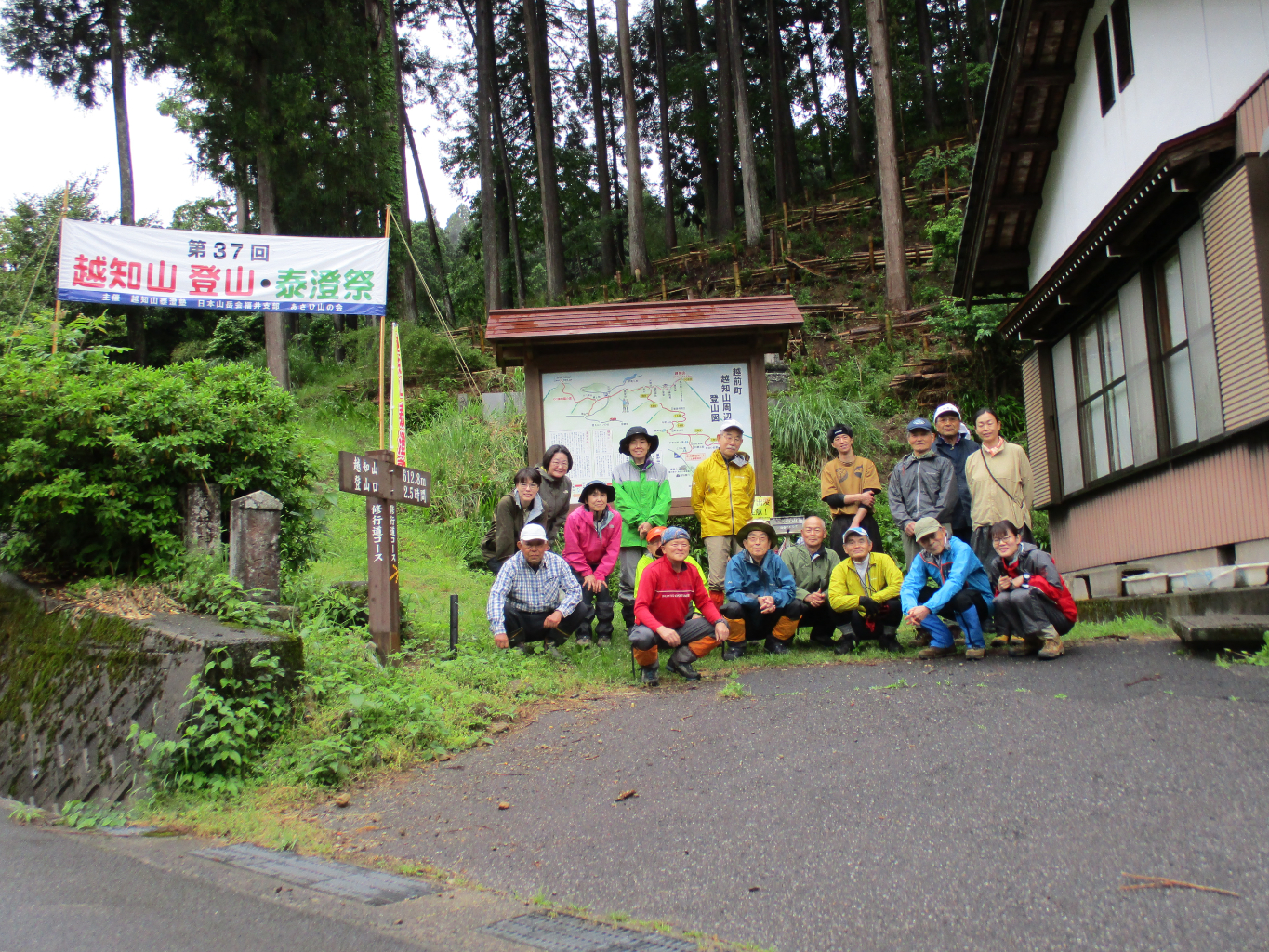 室堂での泰澄祭は福井支部の主催で、越知神社の神主による神事の後で楽団「ロスアミーゴス」による演奏会でゆっくり休息します。午後1時頃出発し、別山・展望台を回った後、往路を戻り、午後3時ごろに流れ解散します。なお、林道経由で越知山室堂まで車道が通じており、体力に自信のない方はこちらからも泰澄祭に参加可能です。
