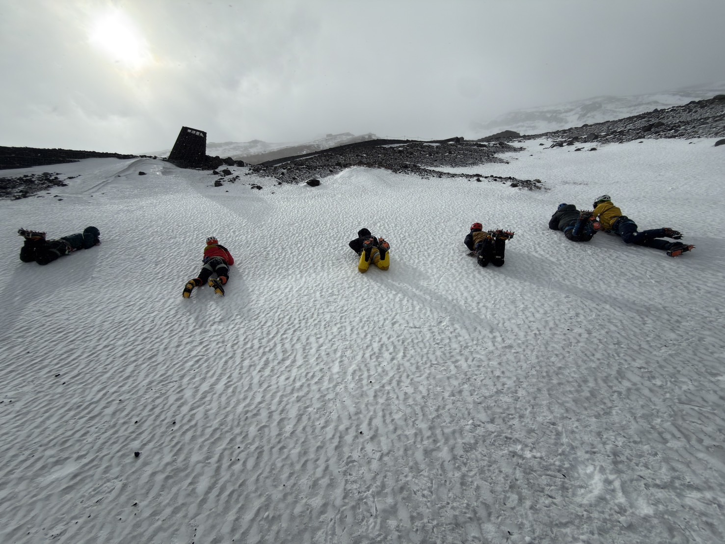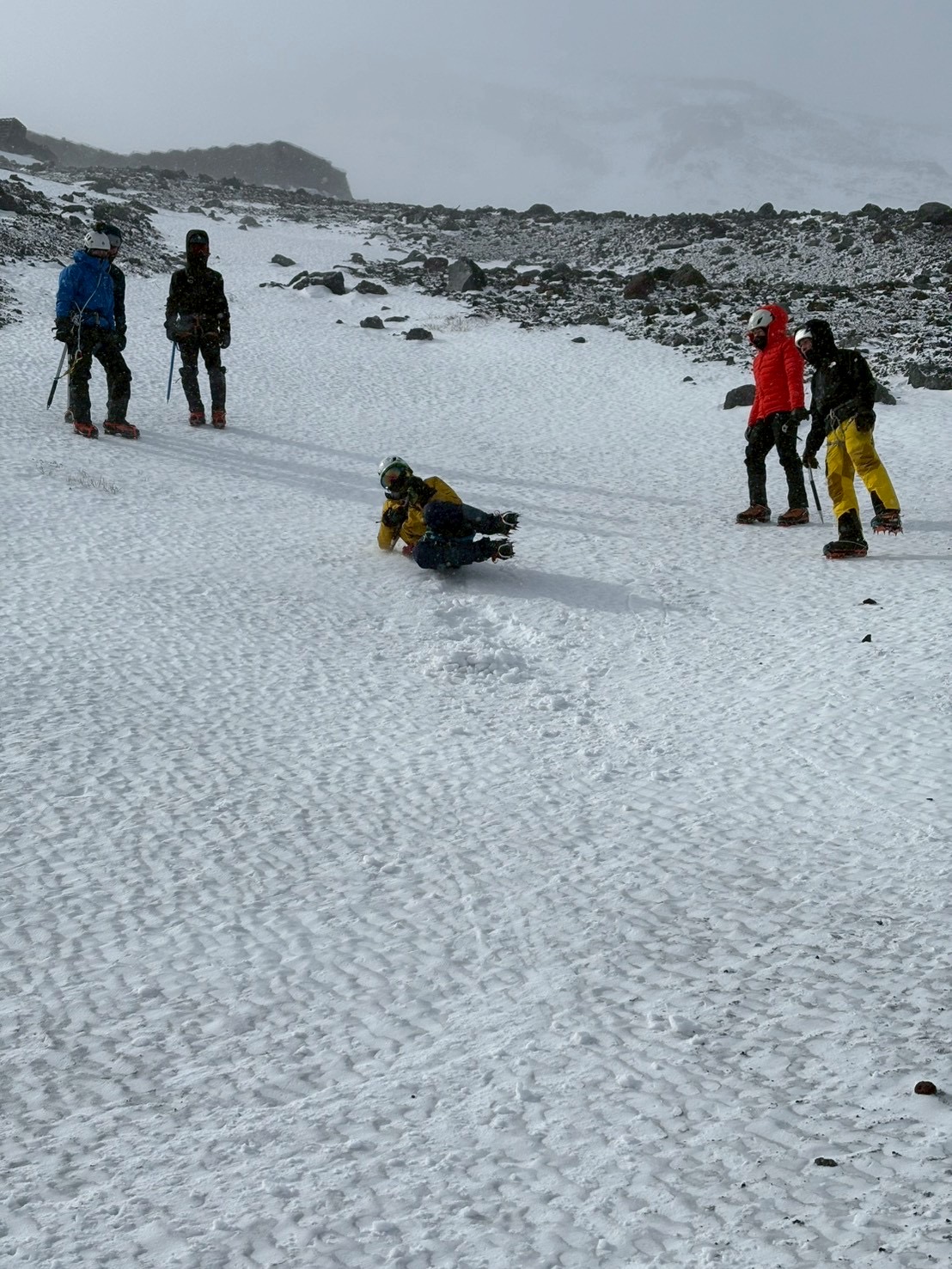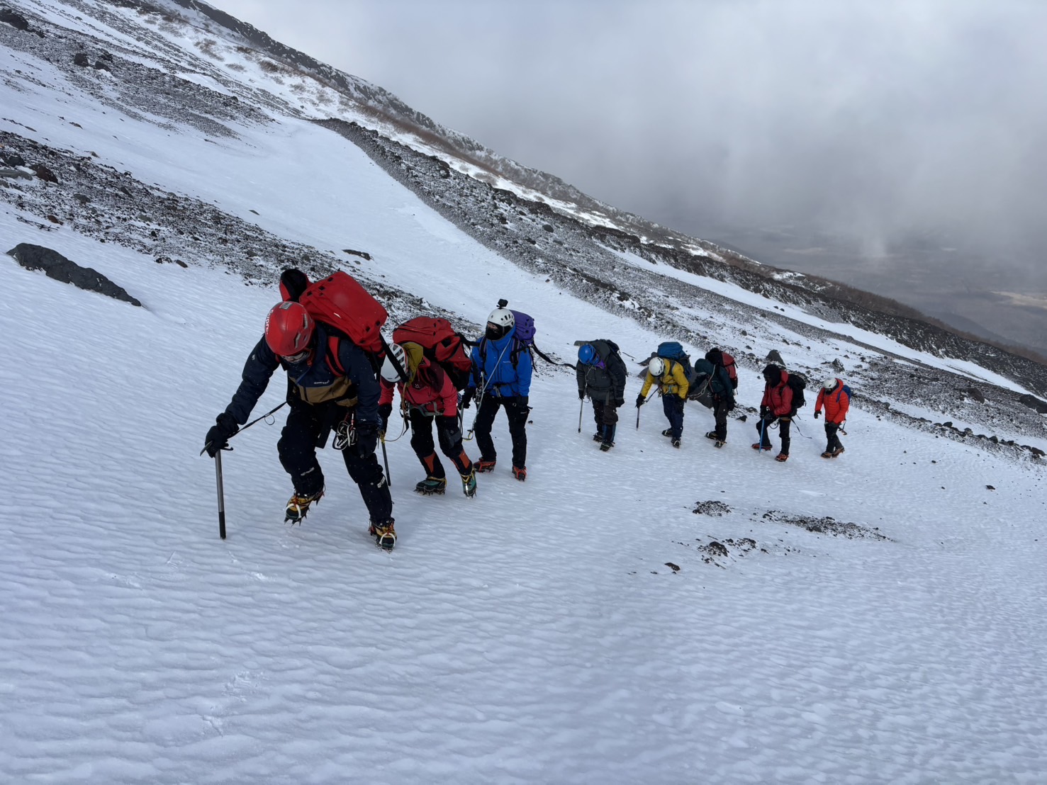 下級生や雪上歩行経験の少ない学生向けに、合同雪上訓練を開催しました。1日目は富士山五合目の佐藤小屋横で幕営し、レイヤリングや装備の扱い、幕営訓練を行いました。2日目は、七合目近くで、合同雪上訓練を実施。ツボ足、アイゼン歩行、様々な地形で歩行訓練、滑落停止訓練を行いました。