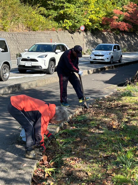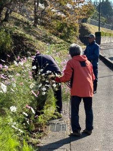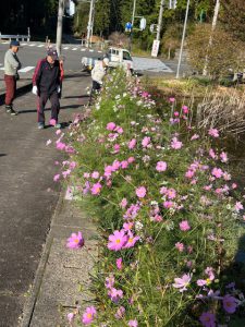 感想:このところ急に秋めいて寒くなってきたが、今日は晴れて絶好の作業日和である。夏に蒔いたコスモスが花を咲かせて池の周りをにぎわせ、その間にヒャクニチソウも花をつけている。1ケ月前には咲いていたヒガンバナは青い葉が伸びて、ただいま栄養補給・球根造成中といったところである。さらにヒガンバナを池に道路側花壇に並べようと、委員長が自宅からたくさんの苗を持参し道路に沿ってコスモスの横へ植えた。