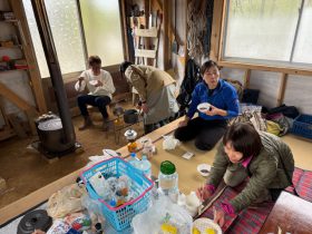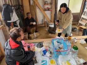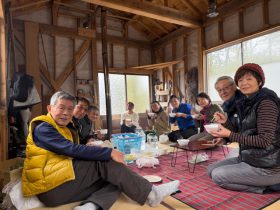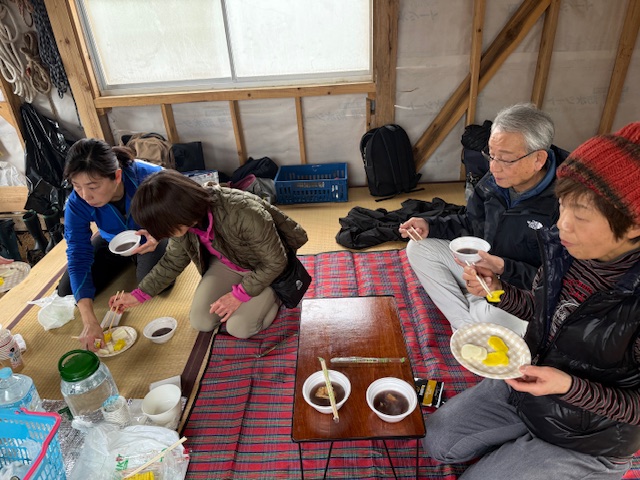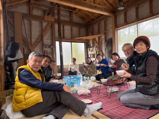 前日は季節外れの陽気で13℃、夜も下がらず温かい朝を迎えたが風が強く気温が下がりだし、8時ごろから雨が雪に変わった。9時ごろからは吹雪で雪の道路となったが森作りの山小屋付近は意外にも雪が少なく風も強くない。外から薪を運んでストーブに火を入れる。なかなか思うように着火しないが燃え始まると小屋の中はすぐに暖かくなった。ストーブの上に置いた大鍋でゼンザイを作り、横に置いた網の上でトチモチ・マルモチを焼き、餅入りゼンザイが完成、新年会が始まった。大根の麹漬け、ピザ、みかん、コーヒーなどが並んで豪華なパーティーとなった。山小屋はストーブ一つで温かく、隙間風も入らず快適だった。時折遠く聞こえる風の音も小さく、北風の影響があまり感じられない立地のように感じた。