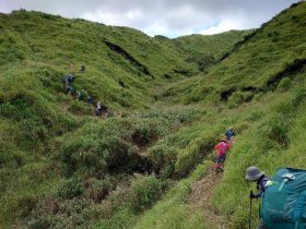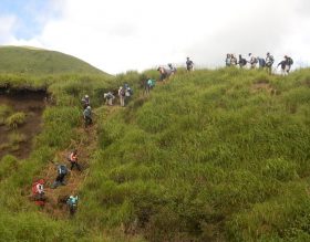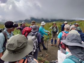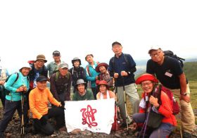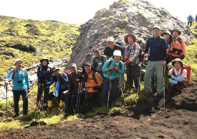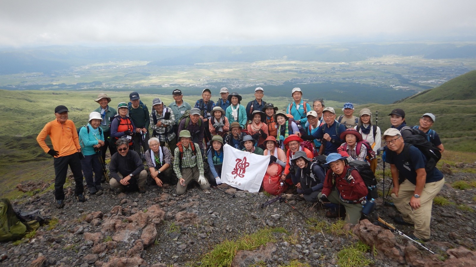 2日目の記念山行は、阿蘇の古道・馬ノ背道の探索である。阿蘇観光道路の大曲から牧草地に入り、背丈以上のカヤを熊本支部のご苦労によって刈り払われた中を行き、草原中の大きな二つの谷を渡り越え、馬の背の稜線を登って、この日のゴールの山上神社の下方の岩場で全員集合の写真を撮って、下るルート途中の通称坊主岩の上で昼食。牧野道を下り、往路を辿って大曲で解散。