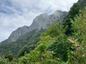 石鎚神社土小屋遥拝殿前から石鎚山を目指すとアサギマダラが出迎えてくれる。