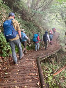 登山道は整備されており、比較的歩きやすいが、前日の雨で所々水溜まりやぬかるみがあり、