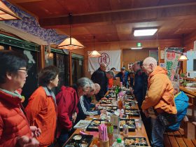 登山終了後、忘年会会場である杵築の横岳荘に向かう。今年も一年の締めくくりとして、昨年同様、杵築の横岳荘で宿泊を兼ねた忘年会を18:00から開催した。参加者は19名。日頃から一緒に山を歩いている仲間が集まり、和やかなひとときを過ごした。開会にあたり、安東支部長から挨拶があり、続いて加藤英彦顧問のご発声で乾杯。食事を楽しみながら、それぞれの山行の思い出や近況報告に花が咲く。途中、参加者全員で輪になり、腕を組んで「坊ガツル賛歌」「いつか或る日」・・・・など次々と山歌を歌う。