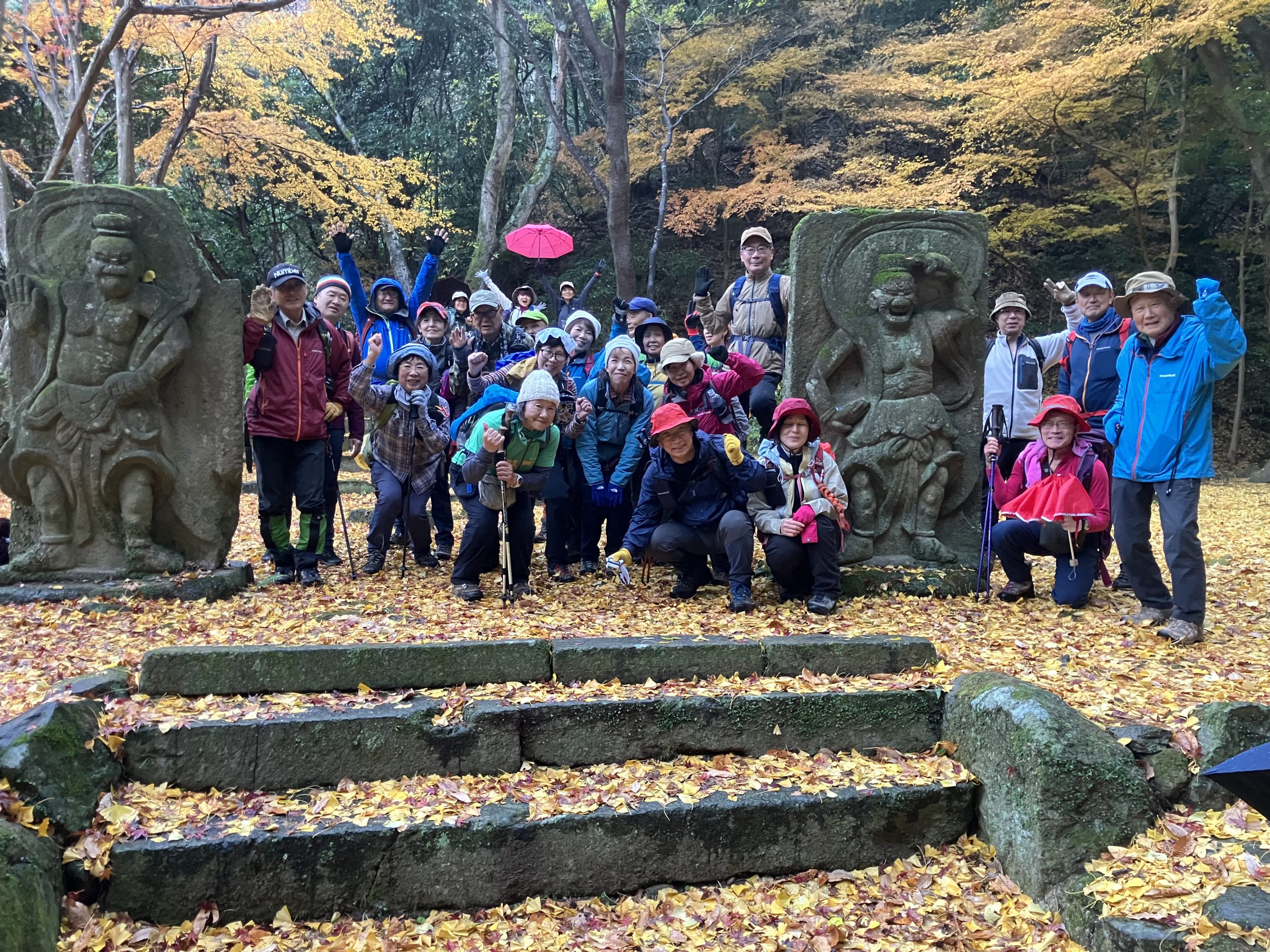 今回の忘年登山は六郷満山の岩屋巡りである。総勢35名の参加となり、安東桂三支部長の挨拶で10:30分に旧千燈寺跡を出発する。天気は朝から曇り。最初から藪こぎ!10分歩くと最初の岩屋、妙見岩屋に到着。ここから、本日最大の難所、落ち葉で足元が滑る中、ロープにつかまりに急登をゆっくり登る。ここを過ぎれば、後はなだらかな尾根歩き。30分程で歩道に出くわす。昼食後、続いて目指すのは天疫神岩屋。道は分かりにくいが15分程でしっかりした石段の上に天疫神岩屋を見つける。石祠の後ろに天疫神の名が刻まれた石柱があり、岩屋の前に石灯篭。天疫神岩屋を下りたあたりから雲生きが怪しくなる。当初の目的であった2つの岩屋めぐりであったが、時間があったので、小雨の中、旧千燈寺跡近くの普賢岩屋と薬師岩屋を見学し忘年登山を終了した。