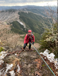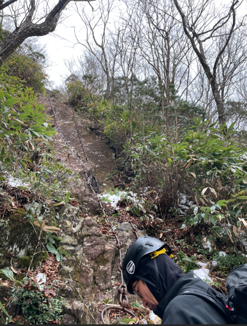 7:00大分、別府を出発⇒鹿野(カノ)インターで高速道路を降りて、11:00駐車場(テント場)へ到着。登山口までの取りつきがとてもよし。テントを設営後11:40早速『莇ケ岳』へ。登山口から急登で約50分、樹林帯にもチラホラ数センチの積雪あり、ほんの少しの雨もあるが基本的に穏やか。莇ケ岳山頂手前には一、二、三と鎖場が三つあり、今回は一と三をアイゼン装着して登攀。鎖もあるし、難易度としては高くはないと思うが、如何せん支点構築、安全確保の徹底、後続者への配慮がまだ自分に不足している部分。リーダー、サブリーダーの指示やこれまでの記憶を引っ張り出し、なんとか莇ケ岳登頂(1,004m 14:50)。山頂には小さいが祠もあり。無事に感謝。15:50下山、テント場へ。夜は共同食。