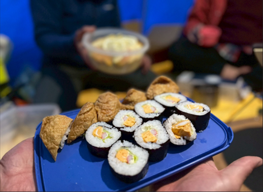 因みに緑の会の方々5名も同日に同山行となり、東九州支部5名と緑5名の計10名が一つのテントで飲食開始。食事担当の大前さんによる、おでん、おいなり、巻きずし、ごぼうサラダ、おはぎ、アジの焼き物は、私の胃袋を満たしてくれたのはもちろん、10名の喧騒も相まってまだ雪降らぬ寒空まで満たしてくれた。9:00就寝。