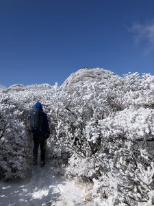 天気も徐々に回復し、青空が見えるようになり、山頂付近では木々には霧氷がつき、純白と吸い込まれるように澄み渡った青空のコントラストが素晴らしく、冬山ならでの景色を堪能する。