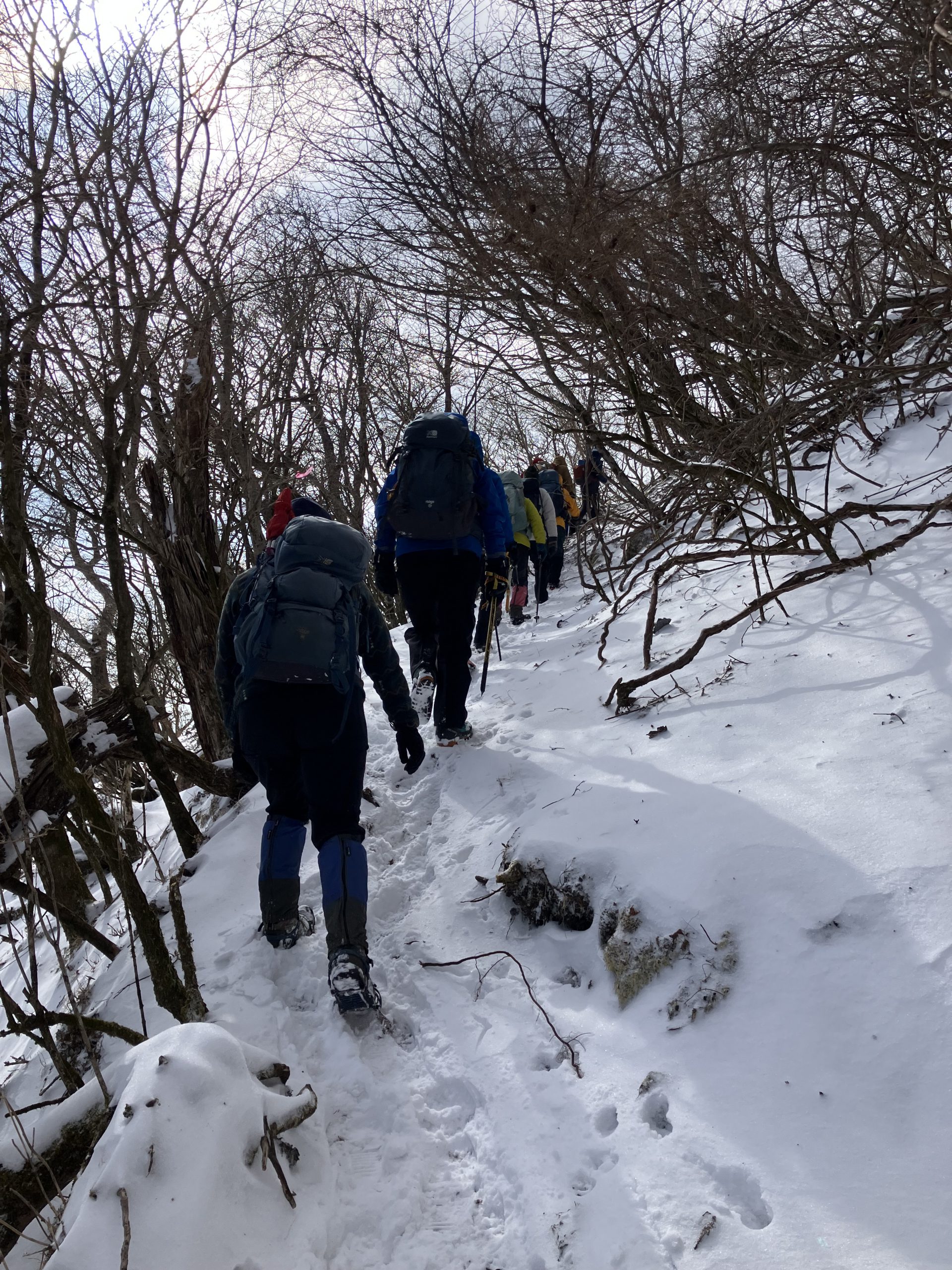鳥居窪から先は雪が多く急登になるので、アイゼンをつけての登攀となる。
