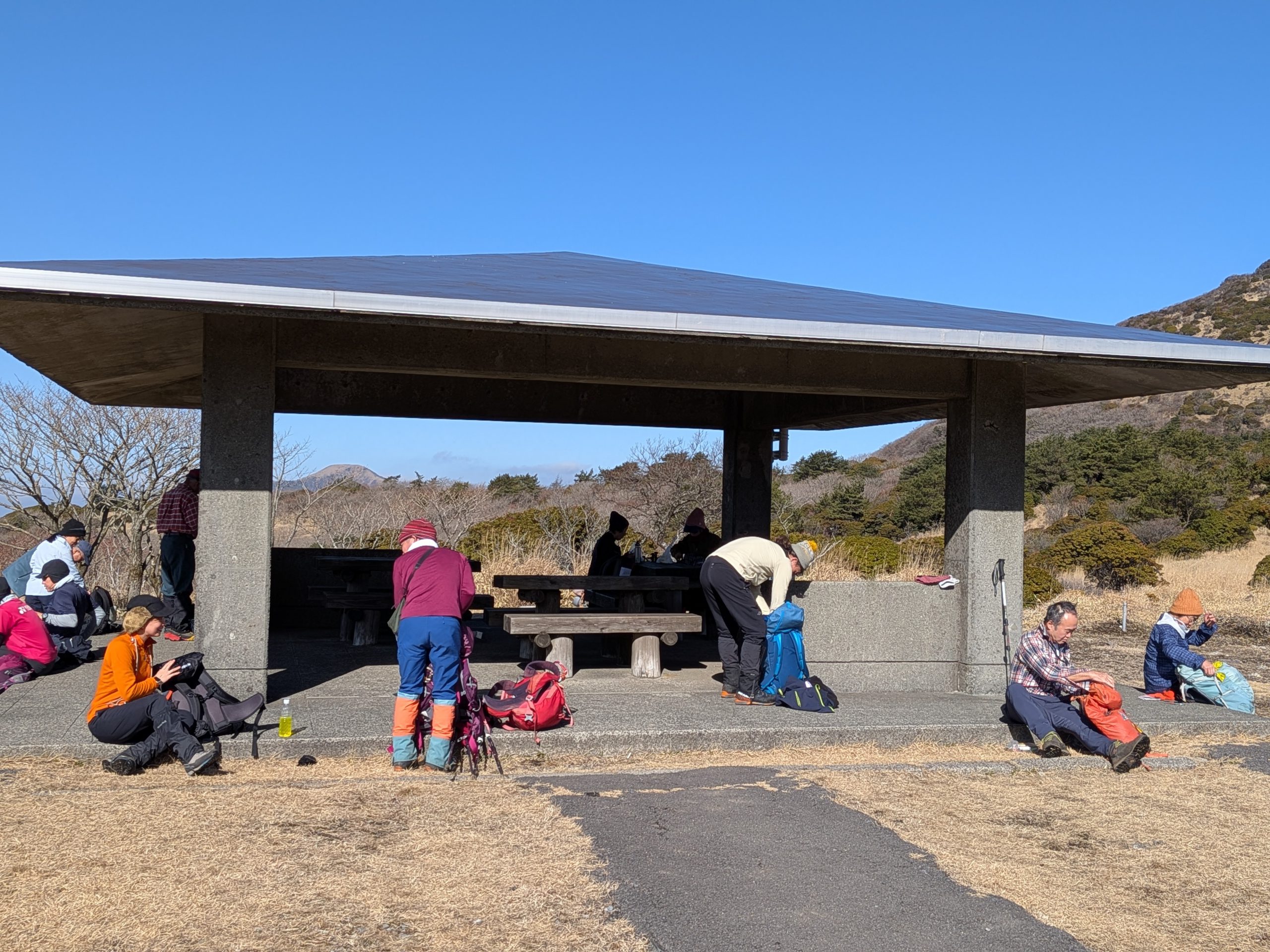 途中の東屋で、休憩 昼食とする。風もなく暖かい。冬山でゆっくり食事できるのはありがたい。