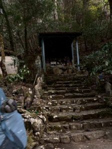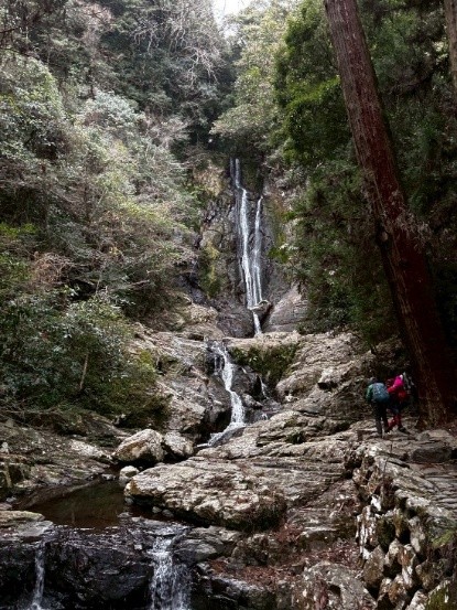滝手前の霊場を通過し、滝見学後、急傾斜に取り付き、林道に出る。後は、基本傾斜少なく、概ね歩きやすい山道が続く。