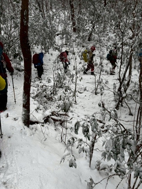 途中から雪となり、稜線縦走は完全な冬景色となる。第一級の寒波襲来の中、標高900.8mという低山ではあるが、冬山らしさを堪能した。