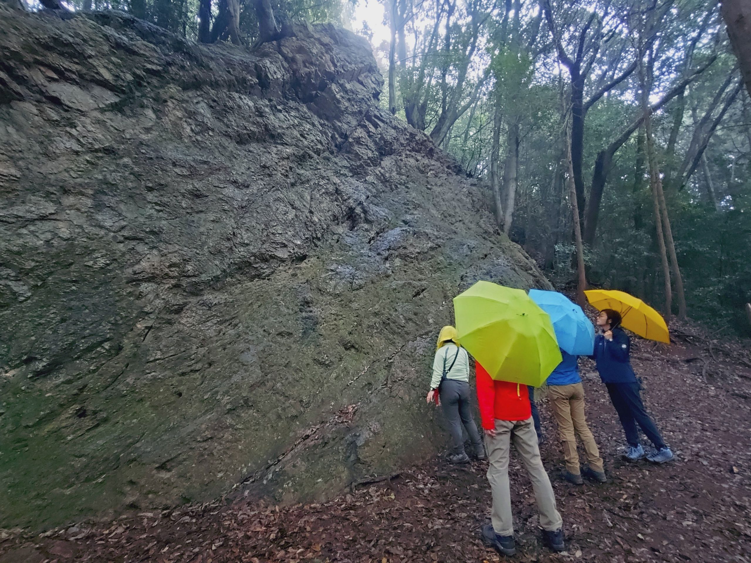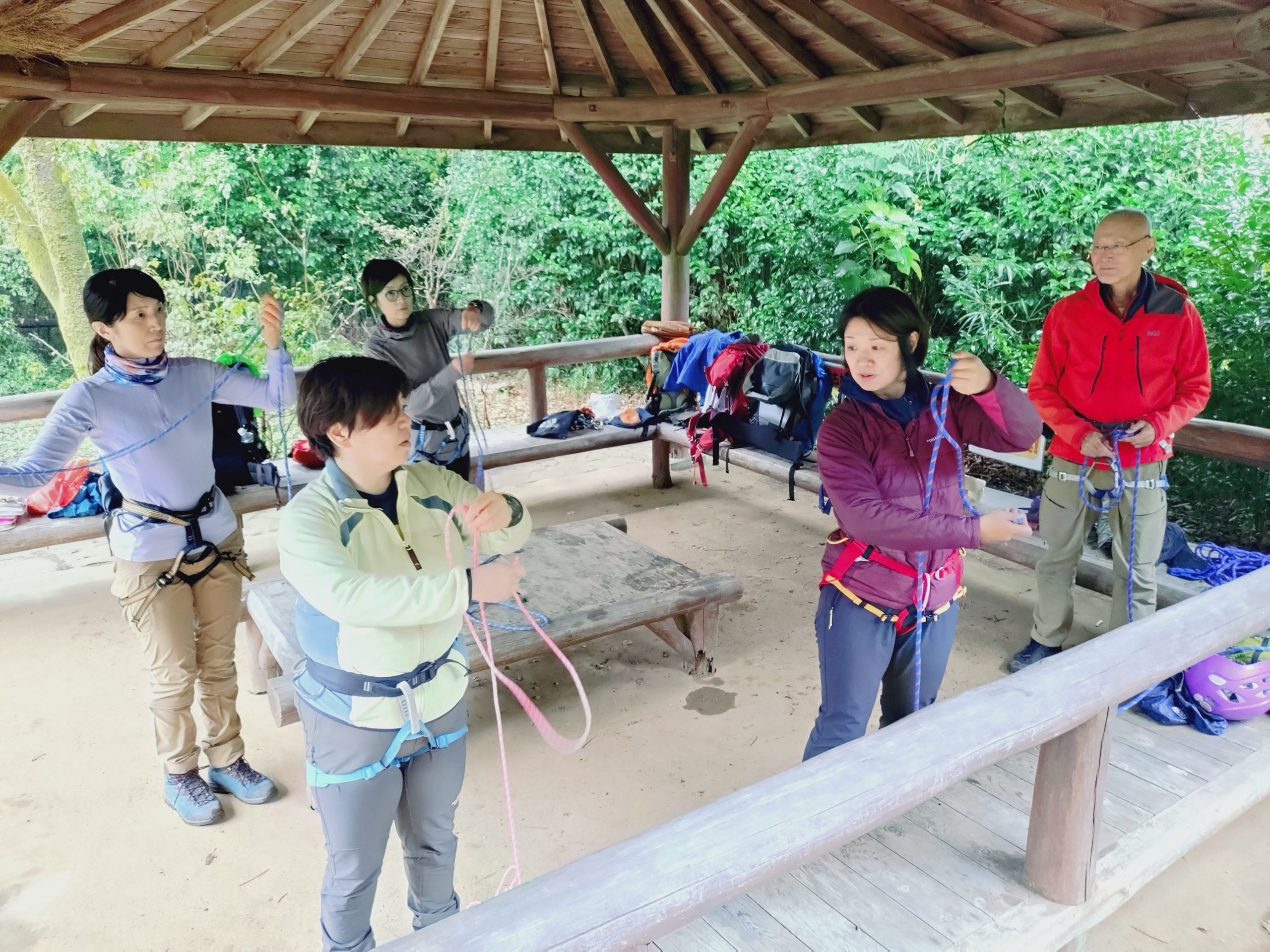 天気予報は曇だったが、8時過ぎに飯能駅に集合してみると小雨がパラパラ。岩場を見るだけでもと現地に向かう。徒歩20分ほどで天覧山の登山口、そこから5分ほどで岩場に到着。巾15~20m、高さ10m程度、適度に足場やクラックもあり、登山靴での岩登りには丁度良い斜度の岩場。岩場の上部にはトップロープの支点に使えそうな樹木が何本もあり、まさにお手頃の場所であった。しかし、雨は止まず、近くの広場の東屋に戻り、そこでロープワークを行うことにした。飯田リーダー、新井サブリーダーの指導で、ハーネスを着用し、ロープを8の字で結ぶ。そのほか、クローブ、ムンター、フィッシャーマン,プルージック、ブーリン(もやい結び)、末端結びや末端長の目安、スリングのかけ方、等々を行い、スリングによるチェストハーネスやシットハーネスも練習。続いて、東屋の支柱を利用して、危険個所のロープ設置と通過方法などを学んだ。1回では中々覚えきれない内容もあり、自宅での反復練習も大切であることを皆で共有した。