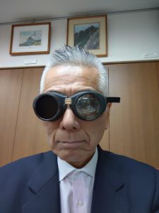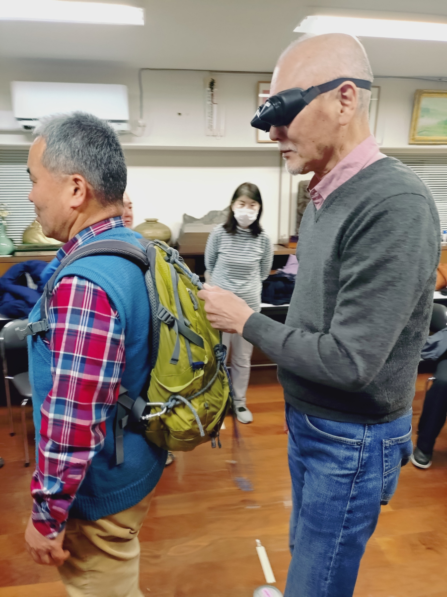 目の障害には、全盲とロービジョンがあり、全盲にも屋根があるところとないところの明るさのわかる人もいます。ロービジョンにもさまざまな種類があり、ひとそれぞれにちがいます。そこで山行部長の清水さんが3種類のゴーグルを取り出して、どのように見えているのかの体験をさせてくれました。